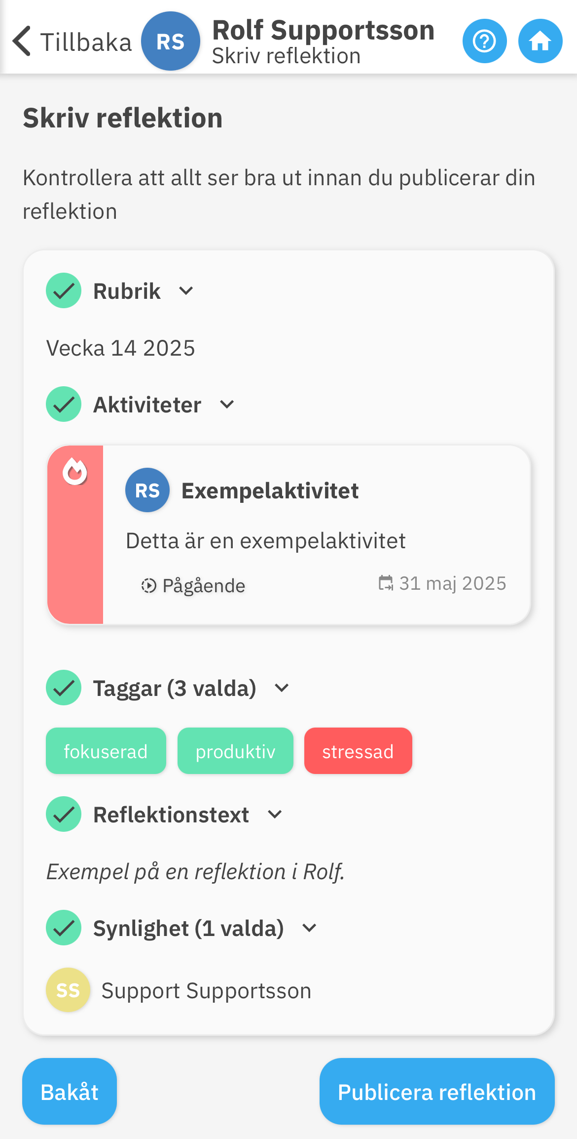 Klicka dig igenom processen till att skriva reflektion genom att välja rubrik, välja en aktivitet som du vill koppla din reflektion emot och välja taggord. Därefter kan du skriva din reflektionstext.