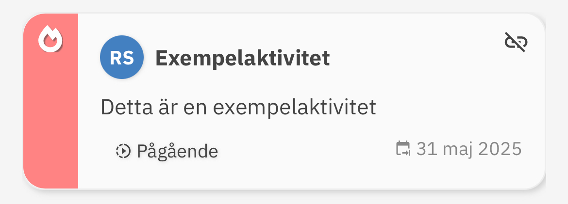 En aktivitet som kopplats till en reflektion, rolfing, utvecklingsplan etcetera kan kopplas bort genom att klicka på ikonen uppe i högra hörnet på aktivitetskortet där möjligheten att koppla bort aktiviteter finns.