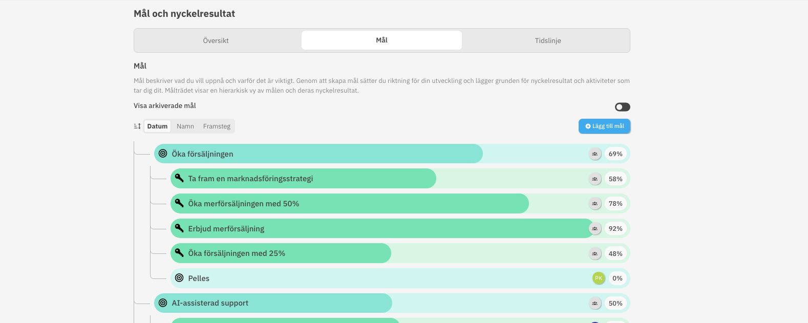 Procentsatserna i Mål-modulen visar målens uppfyllandegrad och baseras på utfallet i nyckelresultat. Om ditt mål har delmål räknas delmålens totala uppfyllandegrad ihop som målets uppfyllandegrad. Om du exempelvis har två delmål med vardera 25% respektive 50% uppfyllandegrad får ditt mål en beräknad uppfyllandegrad om 37,5%.